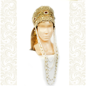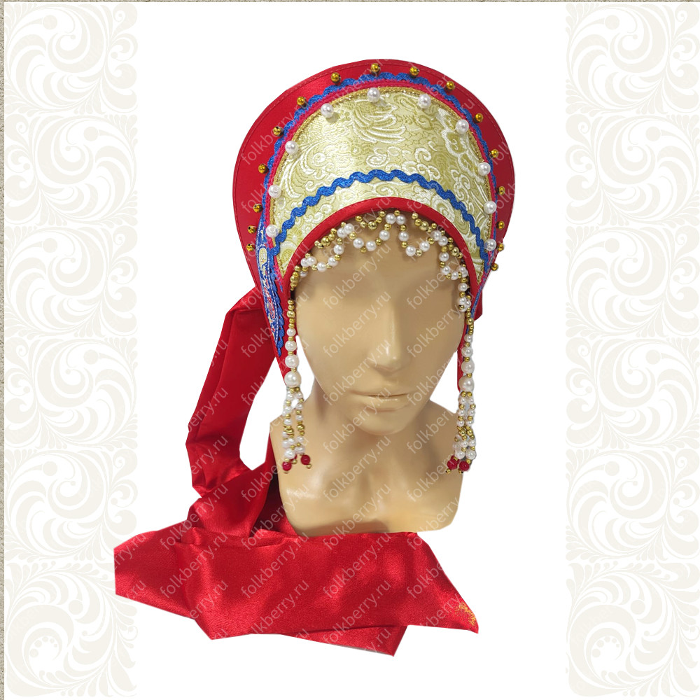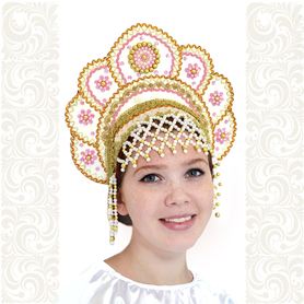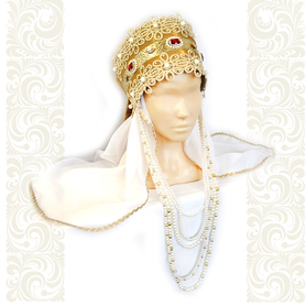 Кокошник выполнен из бархата (или атласа, на Ваш выбор), бусин белого и золотого цвета, пайеток, жаккардовой тесьмы, контрастной по цвету к фону.