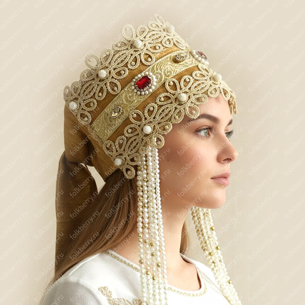 Для кокошника подобраны качественная парча благородного приглушенного золотого цвете, вологодское кружево, стеклянные, стразы рубинового цвета, бусины искусственного жемчуга.