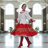 Костюм  выполнен из габардина и красиво подобранного декора в золотистых цветах. Достоинства габардина  в том, что он не мнется, не блестит, как атлас, ложится красивыми  мягкими складками, цвет не выгорает. Юбка  с оборкой, декор в золотистых цветах, по талии на  двойной резинке. Блуза  белого праздничного цвета, с баской,  рукава расширены внизу, с манжетами.   Сзади на блузе шнуровка. Она дает хорошую посадку по фигуре. Костюм предназначен для творческих  сольных и коллективных театральных выступлений.