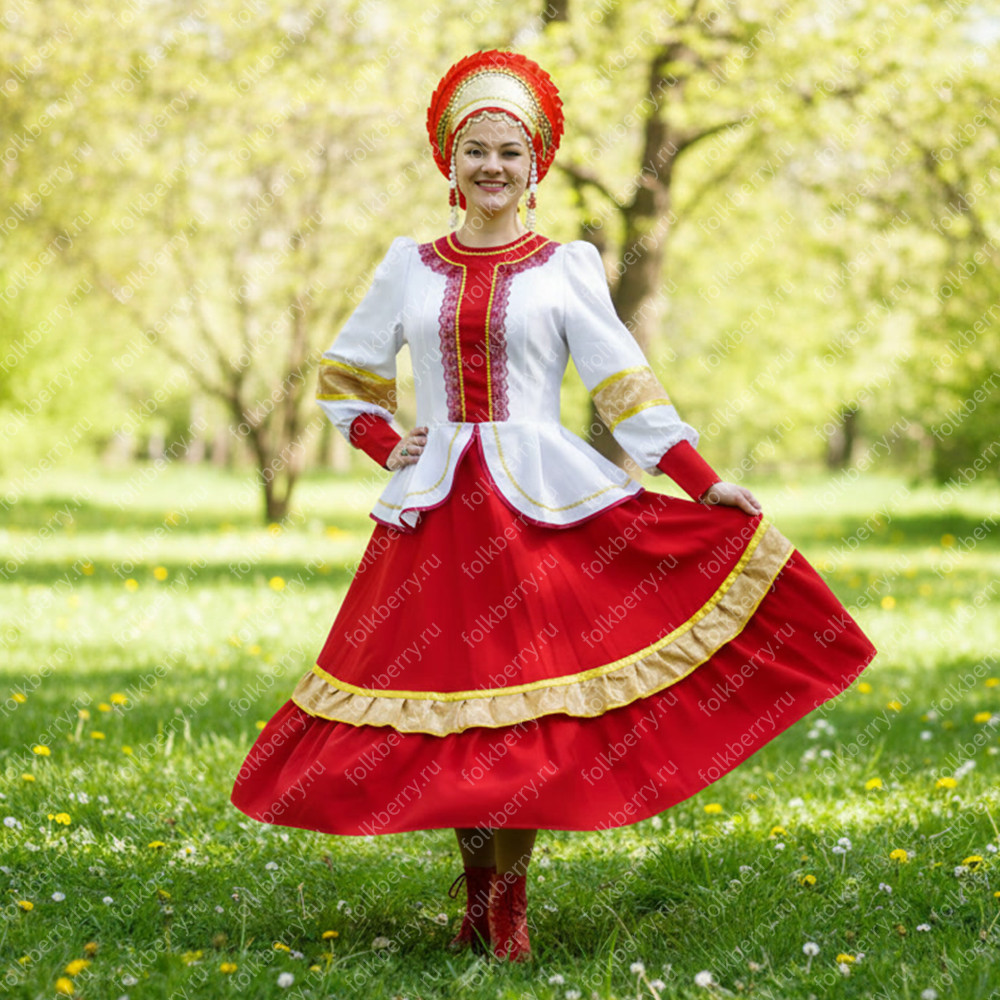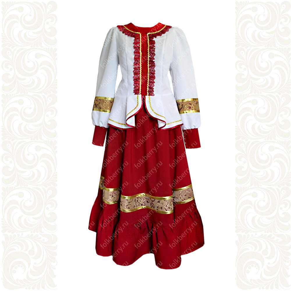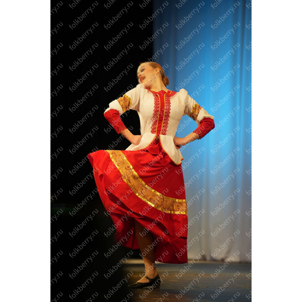 Костюм  выполнен из габардина и красиво подобранного декора в золотистых цветах. Достоинства габардина  в том, что он не мнется, не блестит, как атлас, ложится красивыми  мягкими складками, цвет не выгорает. Юбка  с оборкой, декор в золотистых цветах, по талии на  двойной резинке. Блуза  белого праздничного цвета, с баской,  рукава расширены внизу, с манжетами.   Сзади на блузе шнуровка. Она дает хорошую посадку по фигуре. Костюм предназначен для творческих  сольных и коллективных театральных выступлений.