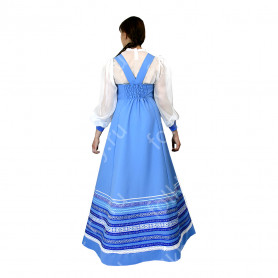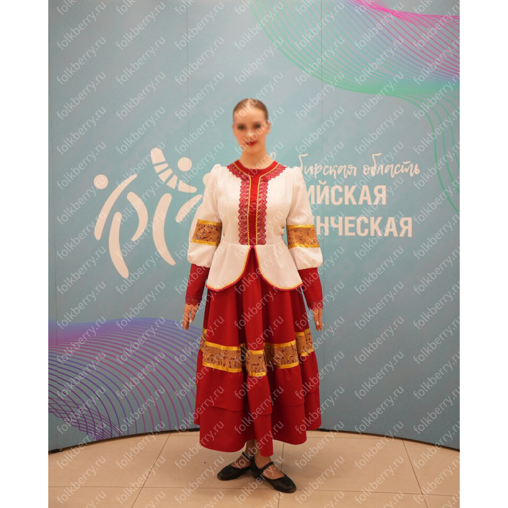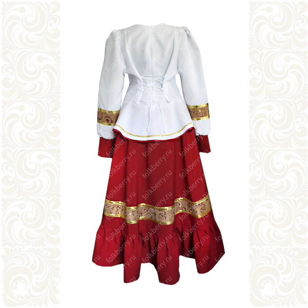 Костюм выполнен из габардина и красиво подобранного декора в золотистых цветах. Достоинства габардина в том, что он не мнется, не блестит, как атлас, ложится красивыми мягкими складками, цвет не выгорает. Юбка с оборкой, декор в золотистых цветах, по талии на двойной резинке. Блуза белого праздничного цвета, с баской, рукава расширены внизу, с манжетами. Сзади на блузе шнуровка. Она дает хорошую посадку по фигуре. Костюм предназначен для творческих сольных и коллективных театральных выступлений.