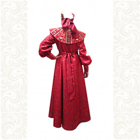 Приталенная модель хорошо сидит по фигуре, расклешенная книзу дает крупные мягкие волны. Сзади расположена застежка «молния». Талия дополнительно подчеркивается поясом. Плечики регулируются по длине. Сарафан украшен широкой полосой из жаккардовой тесьмы, вьюнка, золотистого шнура, кружева.