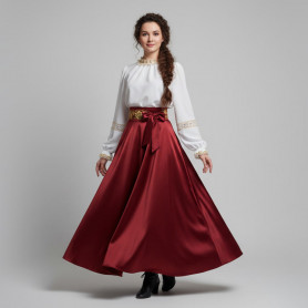 Платье сшито из яркого красного атласа и декорировано вставками с рисунком «хохлома». Юбка фасон полтора «солнца», подол и горловина украшены белым кружевом и тесьмой. Рукава «фонарики» сделаны из легкой, белой органзы.