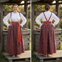 Платье «Солдатка» отрезное по талии, рукав реглан, юбка-почти солнце, длиной немного ниже колена. В комплект входит пояс. Важно, что декор платья выдержан в славянском стиле. Это платье - современное прочтение народных традиций. Женственное, удобное и нарядное, оно дарит ощущение радости и праздника. По стилю замечательно подходит для тематических праздников в детских  учебных заведениях, по фасону и яркости цветов отлично подойдет для танцевальных коллективов.  как правило, дети не стесняются надевать его ( в отличии от длинного русского сарафана ) Платье выполнено из немнущейся, матовой ткани "габардин" символичных для славян цветов ( красного, синего, зеленого, бордового).
