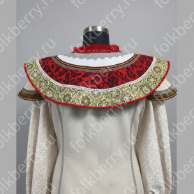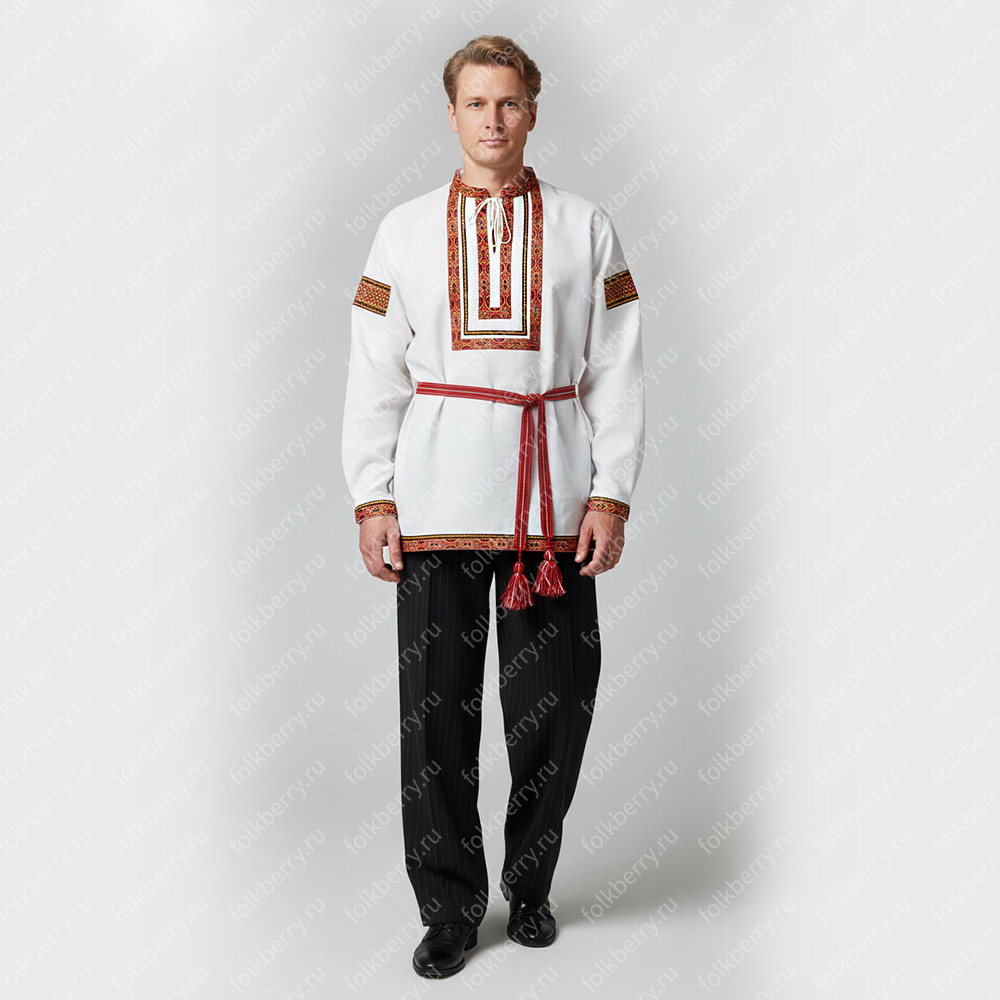 Косоворотка комбинированная, по низу рукава и изделия бордюр красного цвета. Яркая сочная тесьма и контрастность помогают изделию быть ярким, оригинальным и праздничным.