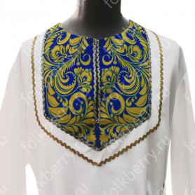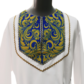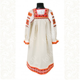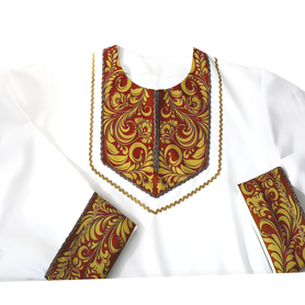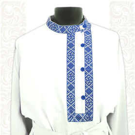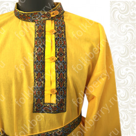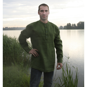 Мужская рубаха «Истоки» выполнена из хбелого льна, имеет втачной рукав. По низу изделия, вороту и рукавам расположена жаккардовая тесьма с обережным рисунком. Дополняет рубаху кушак (пояс) из ткани с тесьмой.