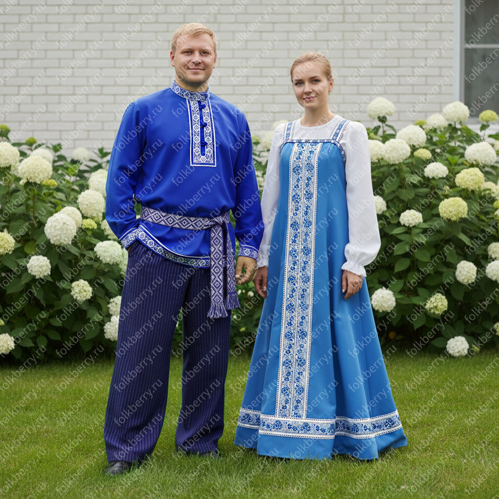 Сарафан с блузой Красна девица в голубом цвете – очень женственная модель русского сарафана. Вверху сарафан идеально облегает грудь, мягко облегает талию, плавно расклешается до 3 метров в диаметре внизу.
