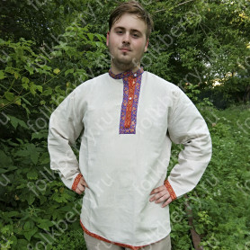 Традиционный длинный сарафан Веста - прекрасный вариант для тех, кто в повседневной жизни носит вещи в русском стиле и для тех, кто надевает подобные вещи по праздникам. Добротный. Комфортный. Красивый. Сарафан выполнен из плотного мягкого небелёного льна молочного цвета, украшен жаккардовой тесьмой в красно-золотистом цвете. Блуза выполнена из хлопка белого цвета, со вставками на рукавах изо льна. Украшена такой же жаккардовой тесьмой, что и сарафан. Длина бретелей регулируется.