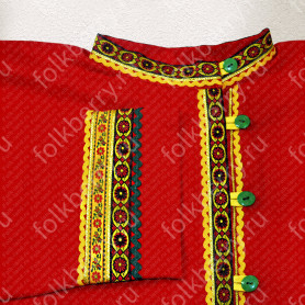 Юбка сшита из ажурного шитья, состоит из трех прямоугольных полотен, соединенных на поясе, украшена красным кружевом, бархоткой в тон, а также блестящей серебристой тесьмой.