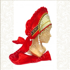 3. Кокошник выполнен из парчи, кружева, страз. К кокошнику прилагаются полупрозрачная фата и длинные бусы-подвески. Высота кокошника 13 см. Сзади ленты-крылья. Кокошник легкий и удобный.
